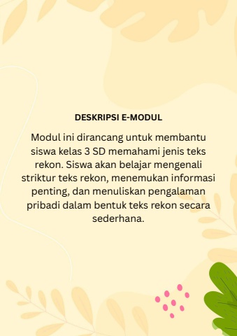 Modul ini dirancang untuk membantusiswa kelas 3 SD memahami jenis teksrekon. Siswa akan belajar mengenalistriktur teks rekon, menemukan informasipenting, dan menuliskan pengalamanpribadi dalam bentuk teks rekon secarasederhana.DESKRIPSI E-MODUL