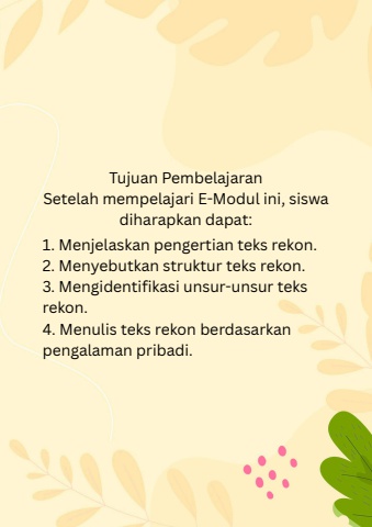 Tujuan PembelajaranSetelah mempelajari E-Modul ini, siswadiharapkan dapat:1. Menjelaskan pengertian teks rekon.2. Menyebutkan struktur teks rekon.3. Mengidentifikasi unsur-unsur teksrekon.4. Menulis teks rekon berdasarkanpengalaman pribadi.